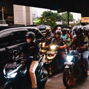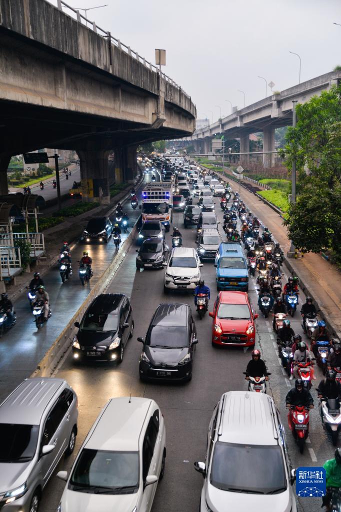 这是6月27日傍晚在印度尼西亚雅加达东区的芝皮南切姆佩达克拍摄的雅加达-万隆出城方向道路上的车流。
