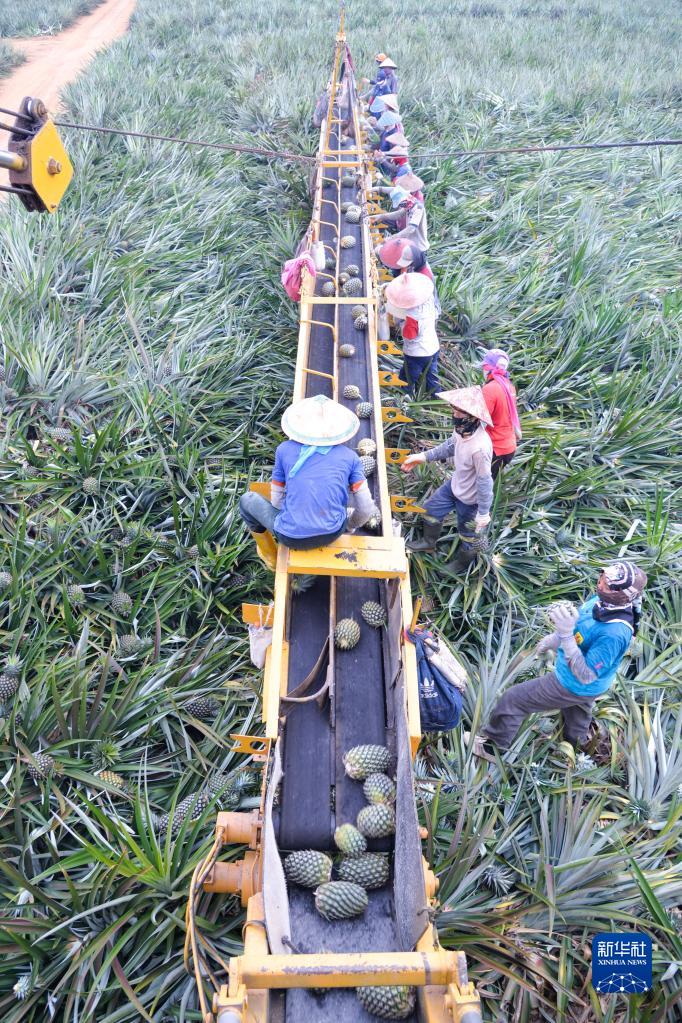 7月5日,在印度尼西亚楠榜省德邦易勿刹县一处菠萝种植园,人们在采摘菠萝。