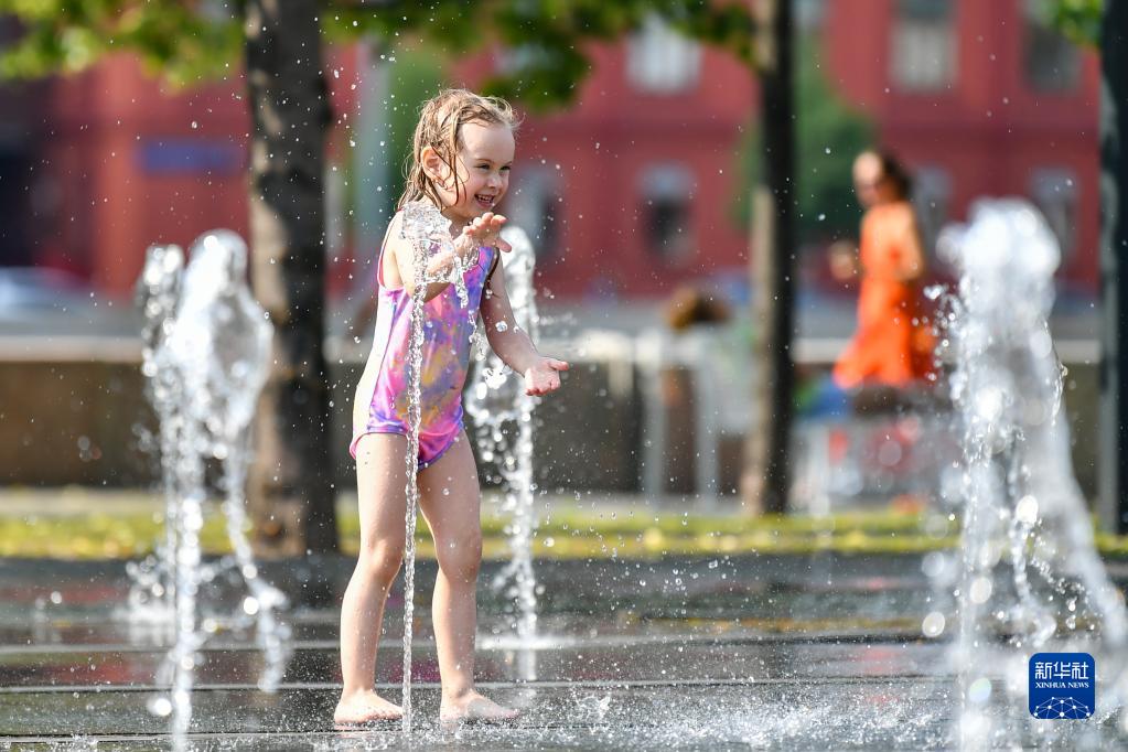 7月6日,在俄罗斯首都莫斯科,儿童在喷泉中玩耍消暑。