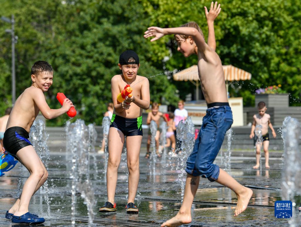 7月6日,在俄罗斯首都莫斯科,儿童在喷泉中玩耍消暑。