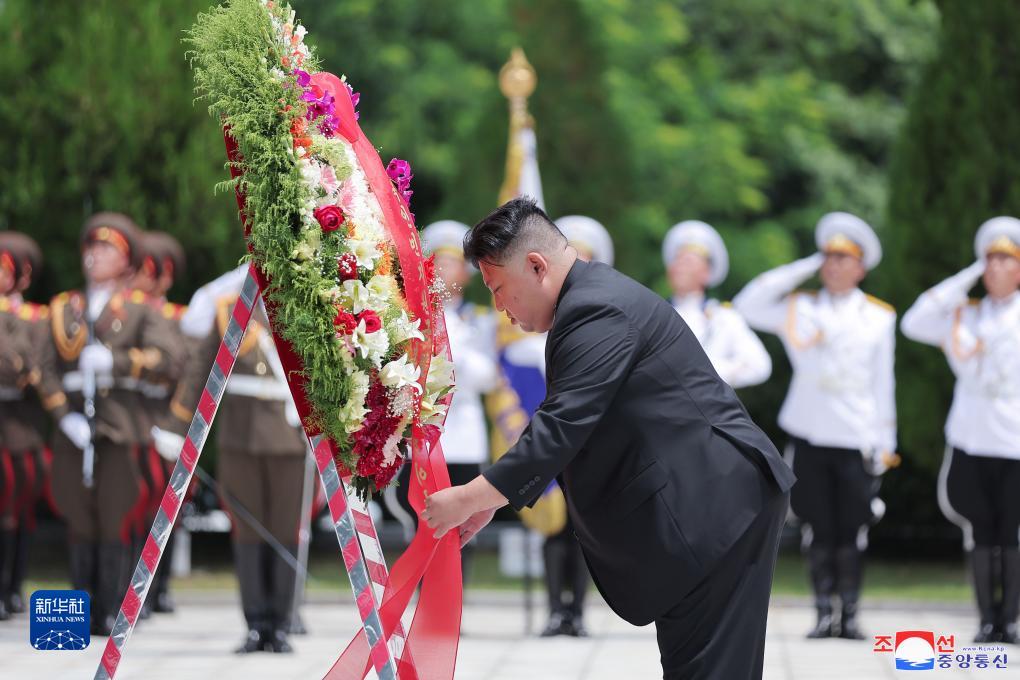 这张朝中社7月26日提供的照片显示,朝鲜劳动党总书记、国务委员长金正恩在朝鲜祖国解放战争胜利70周年之际,参谒位于平安南道桧仓郡的中国人民志愿军烈士陵园。新华社/朝中社