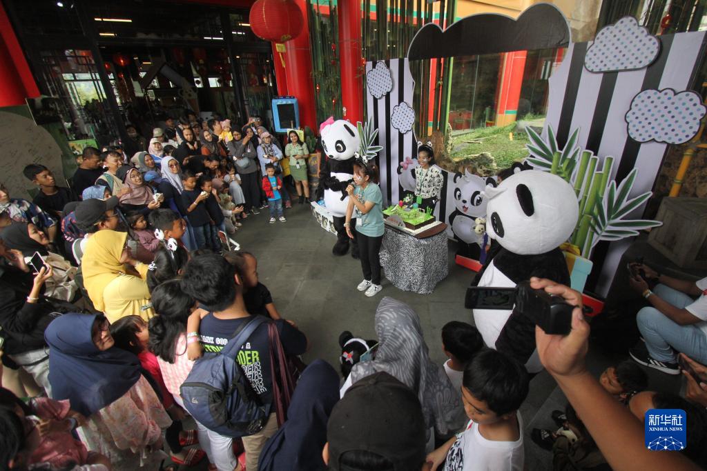 8月5日,在印度尼西亚茂物的印尼野生动物园,人们参加大熊猫“彩陶”的生日庆祝仪式。