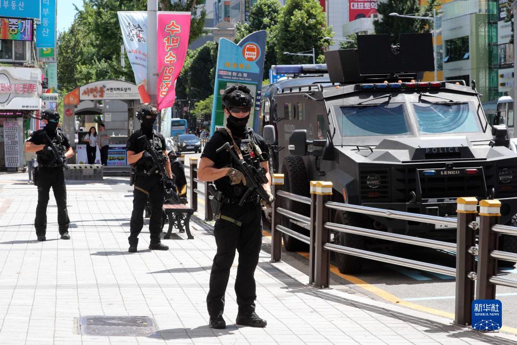 8月6日,全副武装的特警在韩国釜山街头巡逻。