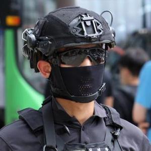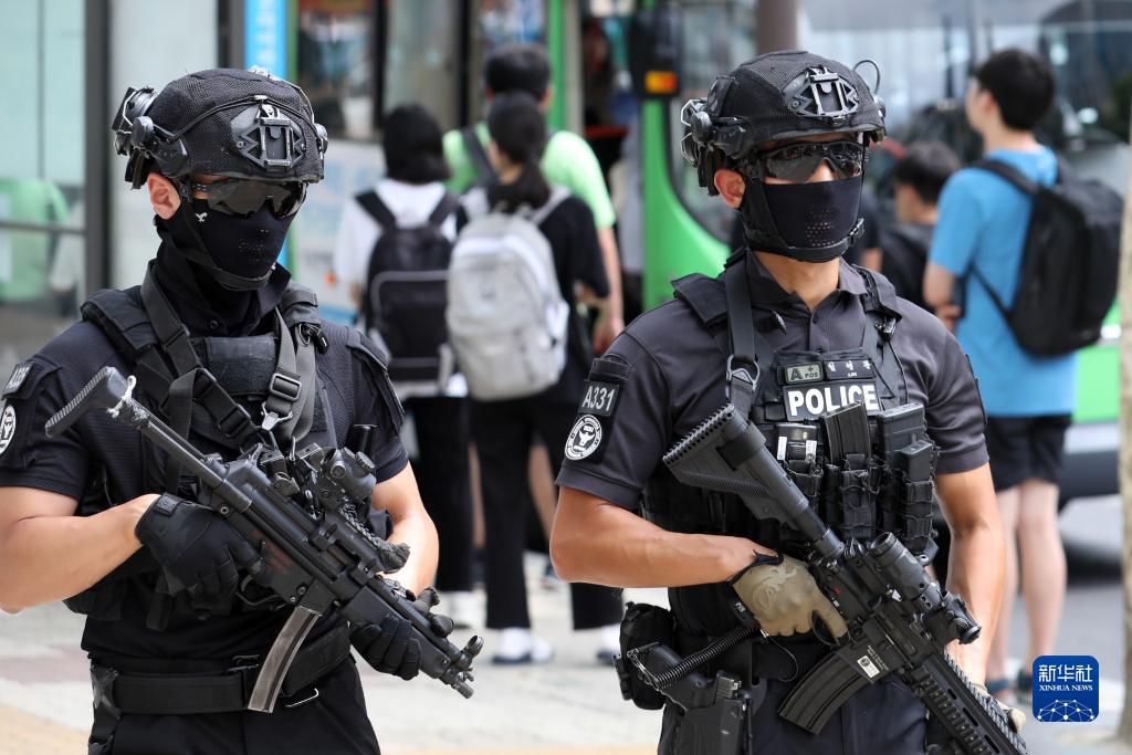 8月6日,全副武装的特警在韩国首尔江南区街头巡逻。