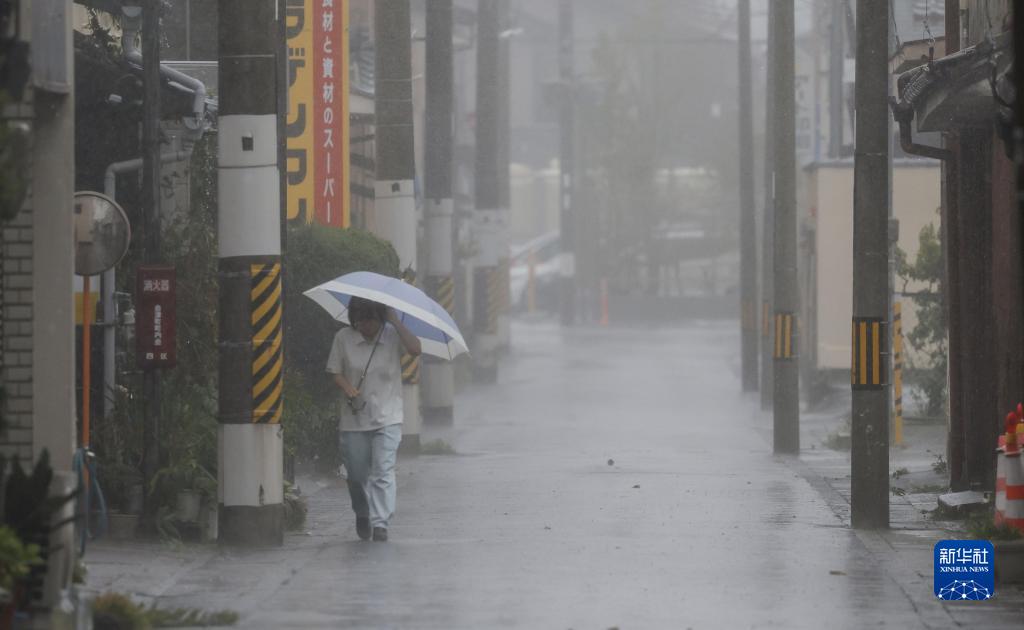 8月15日,一名女子在日本和歌山县田边市街头冒雨出行。
