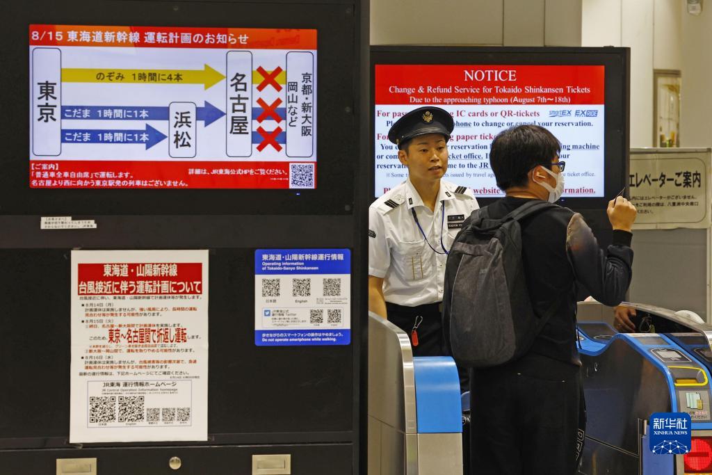 8月15日,日本东京站的电子告示牌显示,受恶劣天气影响,东海道新干线部分路段停运。