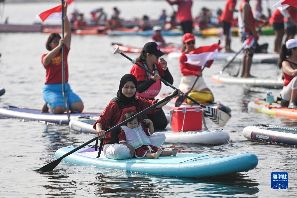 8月17日,在印度尼西亚雅加达安卒海湾,水上运动爱好者参加活动,庆祝印尼独立日。