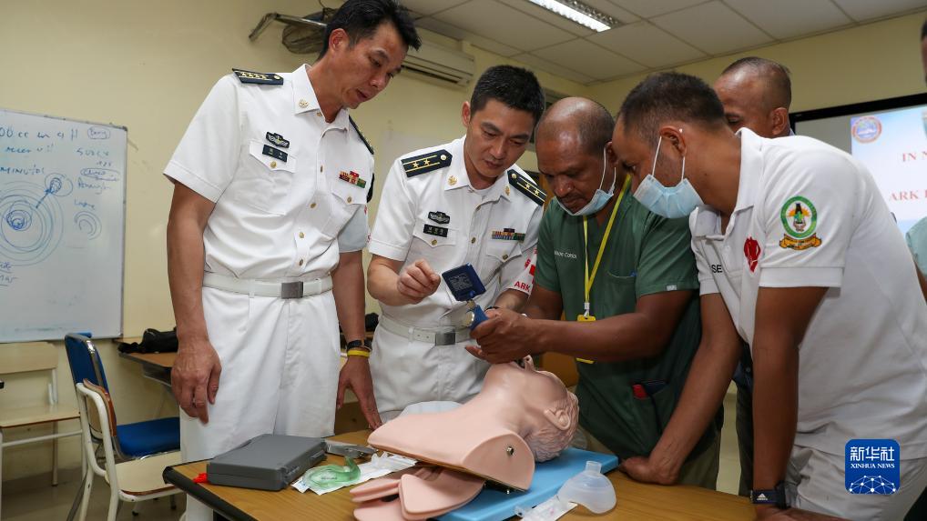 中国海军“和平方舟”号医院船派出医疗专家分队赴东帝汶国立医院进行ACLS培训,医院船医疗专家为当地医护人员进行实操讲解(9月5日摄)。新华社记者 黎云 摄