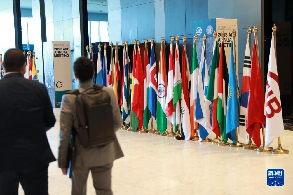 9月26日,在埃及沙姆沙伊赫举行的亚投行第八届理事会年会期间,参会者走过亚投行成员国国旗。