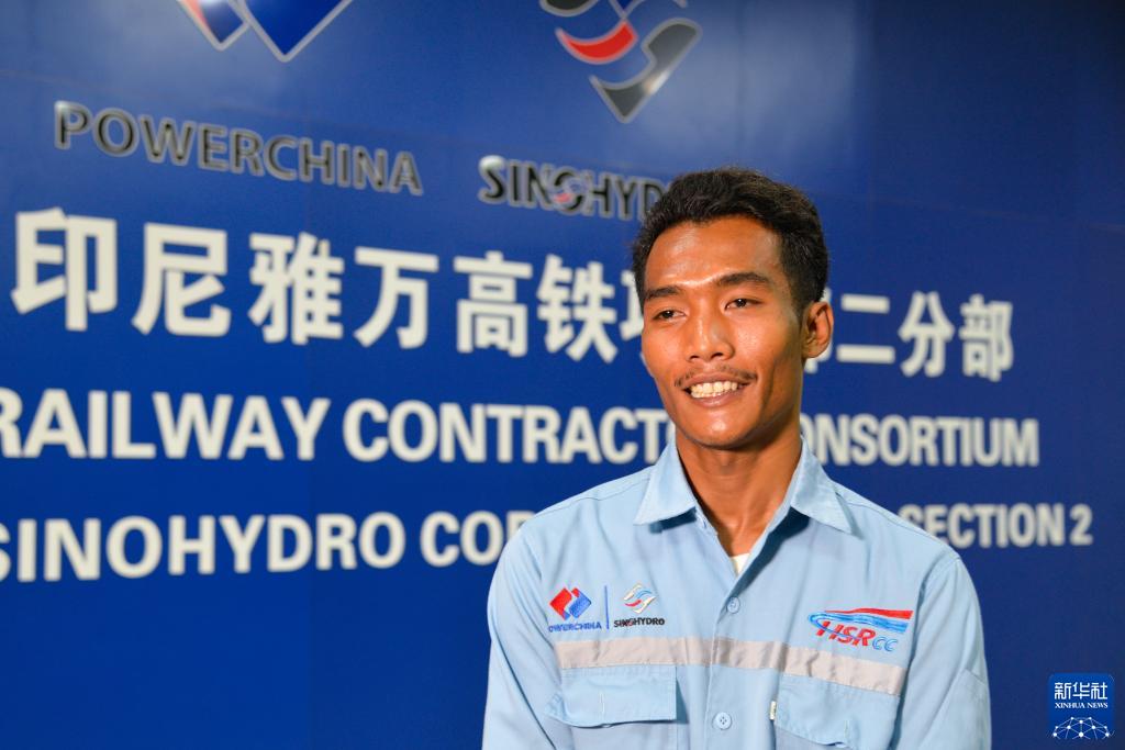 8月13日,在印度尼西亚普哇加达,中国电建水电七局雅万高铁项目部工人海鲁尔·伊克马尔接受新华社记者采访。新华社记者 徐钦 摄