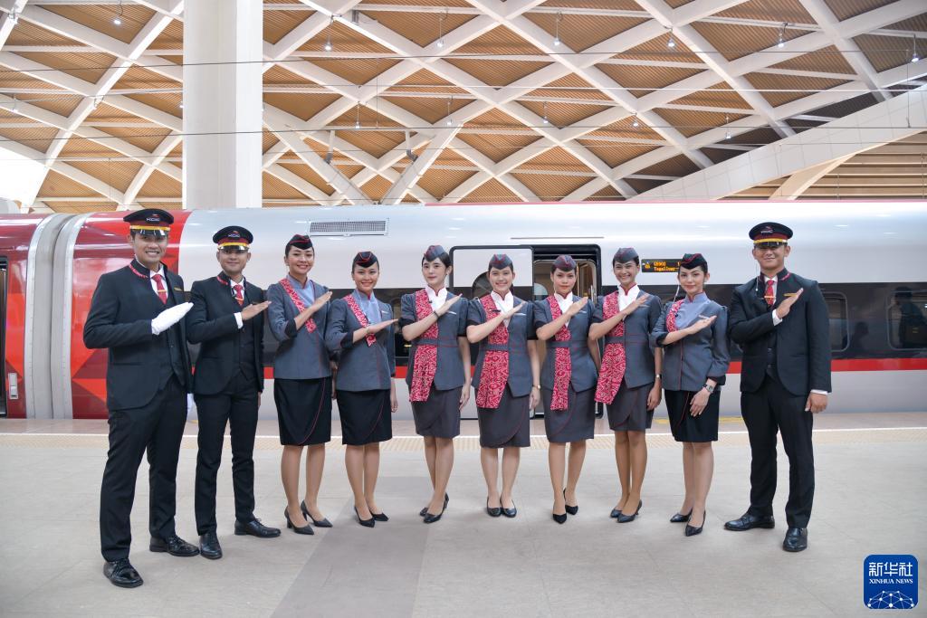 10月2日,在印度尼西亚雅加达哈利姆高铁站,乘务人员在站台上摆出寓意“快速”的手势和雅万高铁动车组合影。新华社记者 徐钦 摄