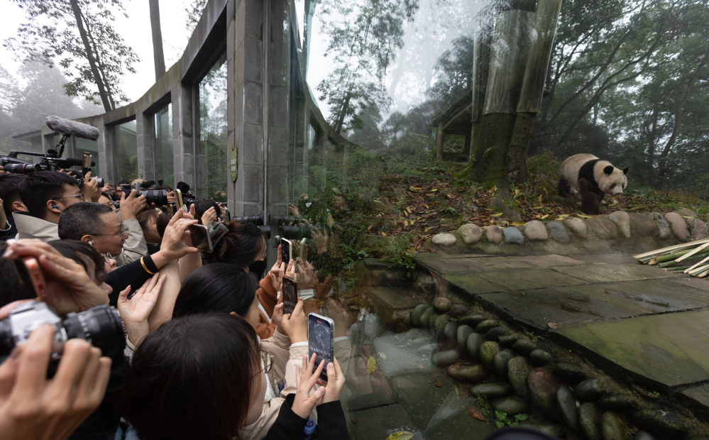 四川雅安碧峰峡,日本大熊猫摄影师高氏贵博在人群中踮起脚尖,和一同来探望“香香”的日本粉丝们等待着。当娇憨的“香香”现身林间时,他高举相机、按下快门,成就他拍摄大熊猫的3371天。