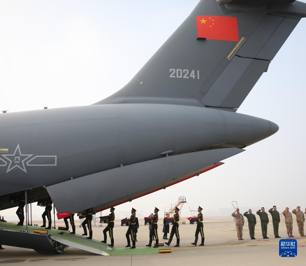 11月23日,在韩国仁川国际机场,中国人民解放军礼兵护送烈士棺椁登上解放军空军专机。