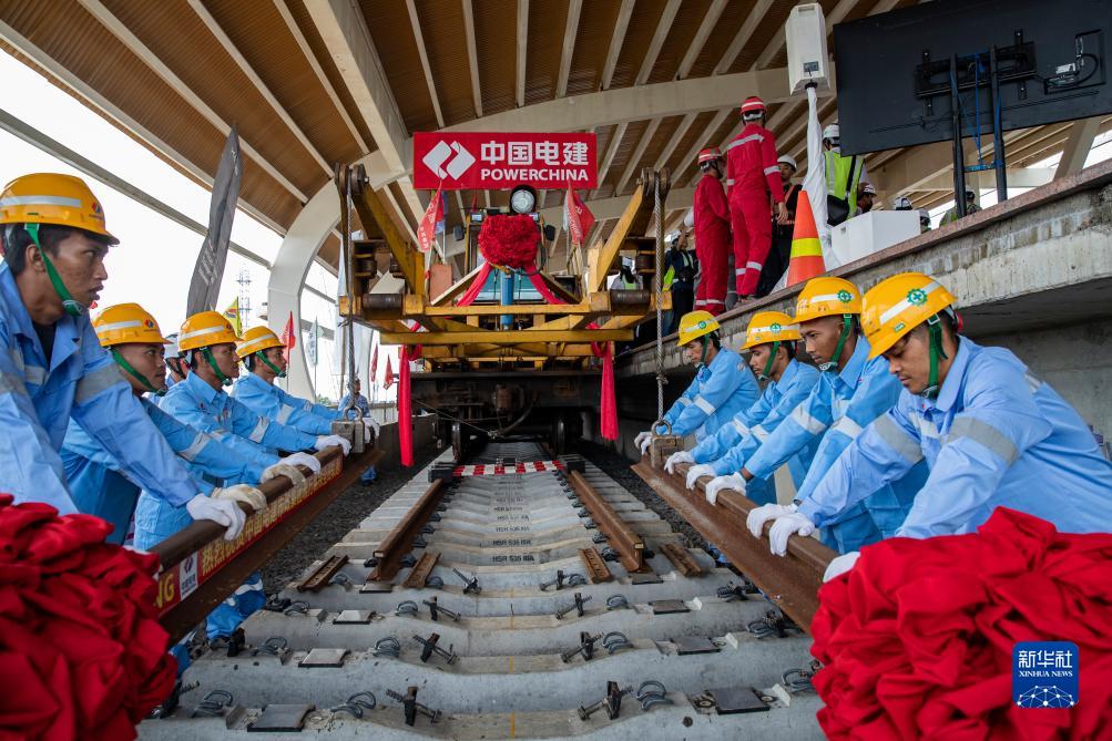 3月31日,在印度尼西亚雅加达雅万高铁哈利姆车站,工人铺设雅万高铁全线最后一根钢轨。当日,雅万高铁全线铺轨完成。