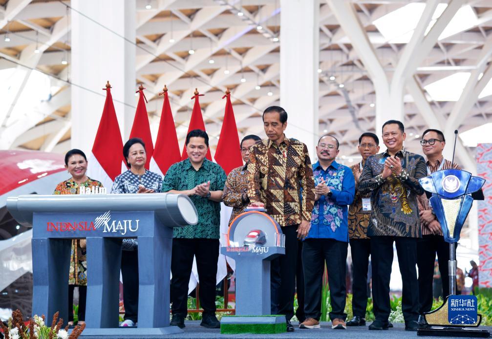 10月2日,在印度尼西亚雅加达哈利姆高铁站,印尼总统佐科(前)在雅万高铁启用仪式上按下启用键,宣布雅万高铁正式启用。