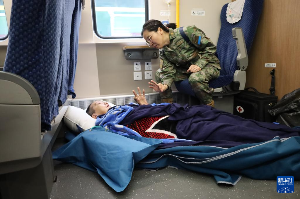 12月24日,中国人民解放军援老挝人民军103医院医疗专家组成员护送伤者乘坐中老铁路列车回国。新华社记者 马淮钊 摄