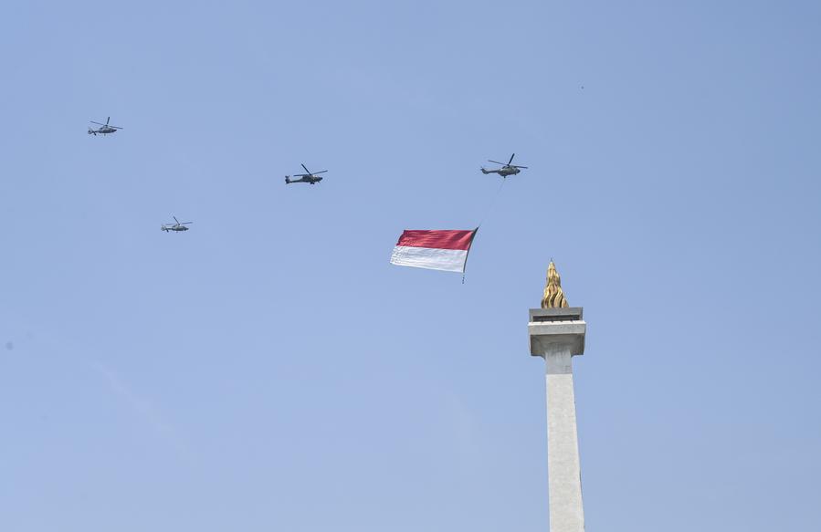 2023年8月17日,悬挂印度尼西亚国旗的飞机编队飞过首都雅加达的民族独立纪念碑上空。新华社发(祖卡南 摄)