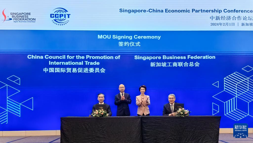 2月1日,中国国际贸易促进委员会与新加坡工商联合总会的代表在新加坡举行的中新经济合作论坛上续签合作备忘录。