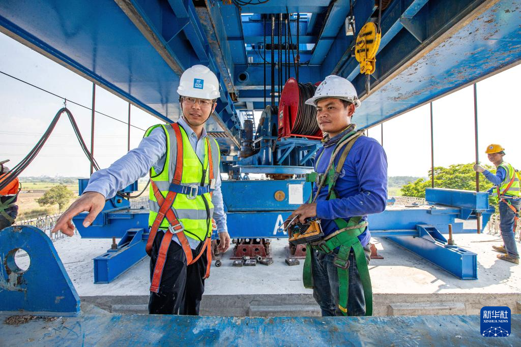 2月7日,在泰国大城府,中泰高铁项目工作人员检查节段梁。新华社记者 王腾 摄