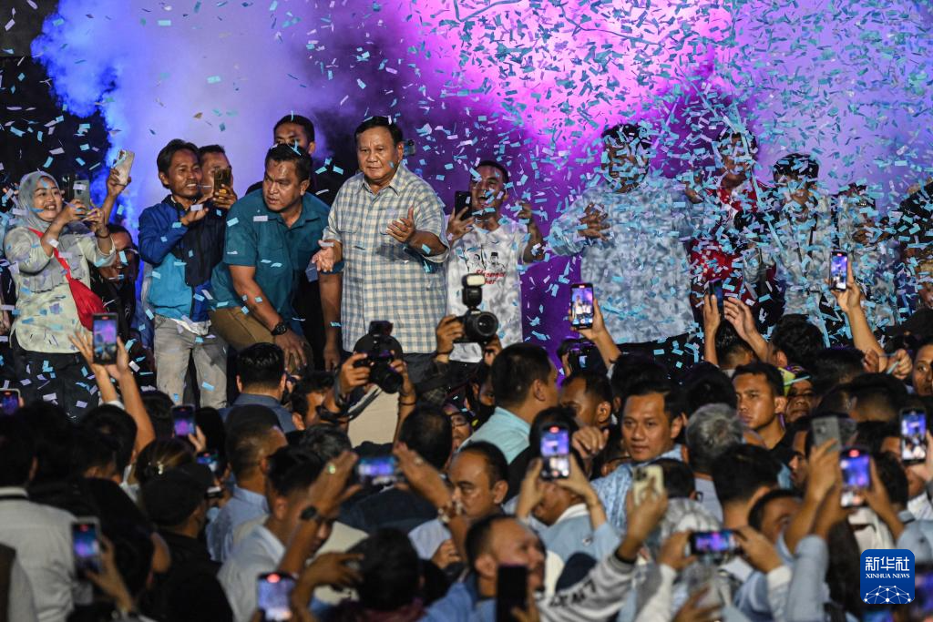 2月14日,在印度尼西亚雅加达,现任国防部长普拉博沃·苏比安托(中)在集会上庆祝获胜。