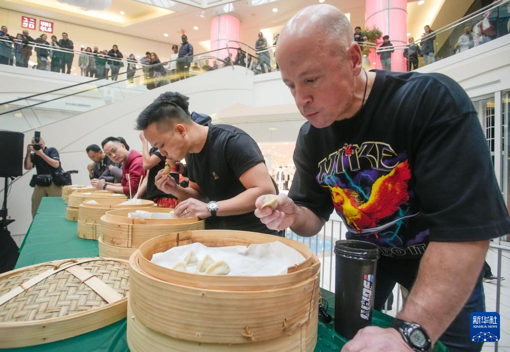 2月24日,在加拿大伯纳比市,人们在元宵节庆祝活动中参加吃饺子大赛。