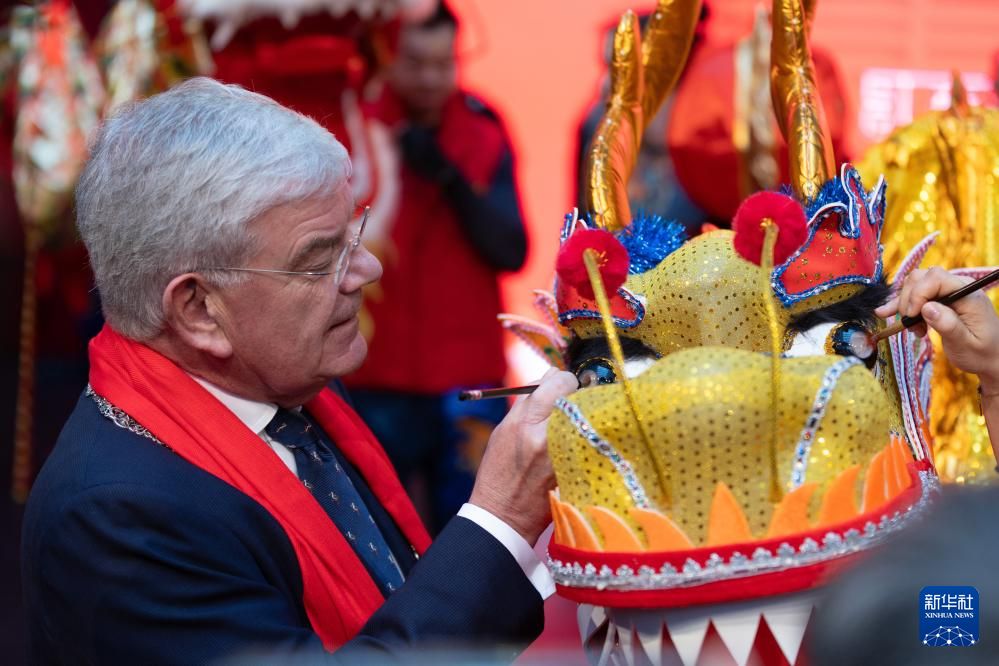 2月24日,海牙市长范扎能在荷兰海牙市政厅内为舞龙点睛。当日,“福龙迎新春”暨元宵节庙会活动在荷兰海牙市政厅举行。