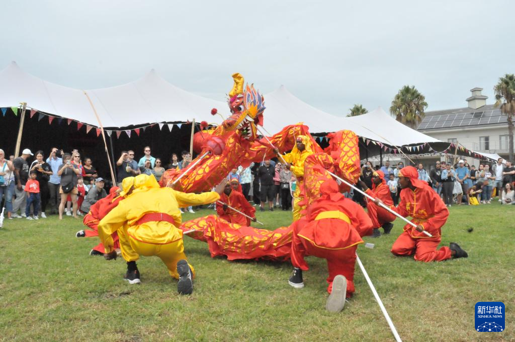 2月24日,在南非开普敦,人们在元宵节庙会上观看舞龙表演。