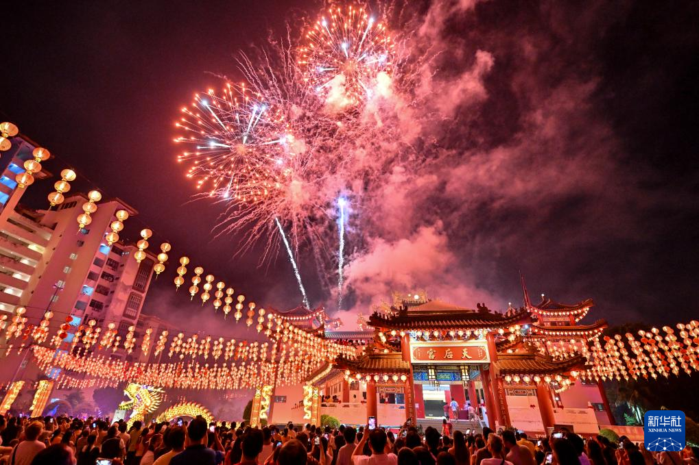 这是2月24日在马来西亚首都吉隆坡拍摄的天后宫烟花表演,众多市民到场一同庆祝元宵佳节。