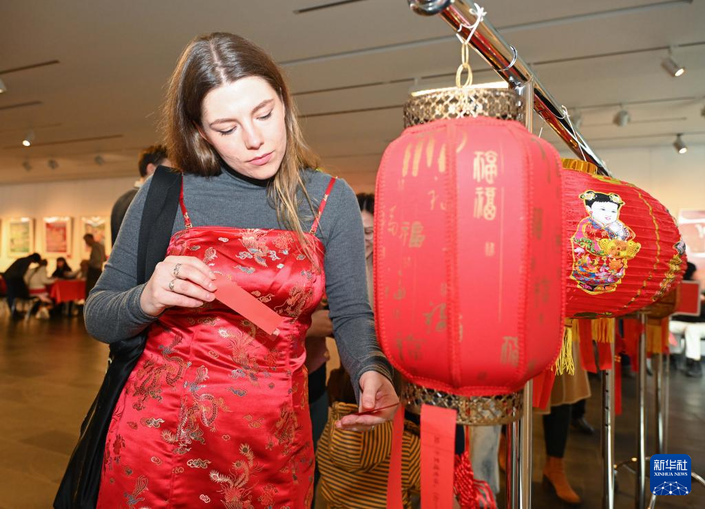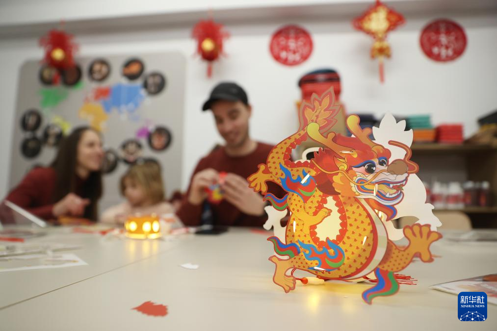2月24日,人们在比利时班什举行的“金龙迎新——2024比利时生肖设计展”期间体验制作龙形灯笼。