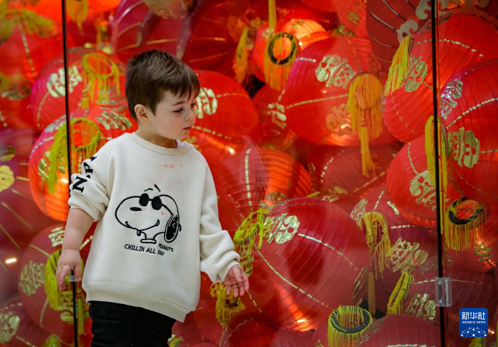 2月24日,在加拿大伯纳比市,一名男孩在元宵节庆祝活动中观赏花灯装饰。