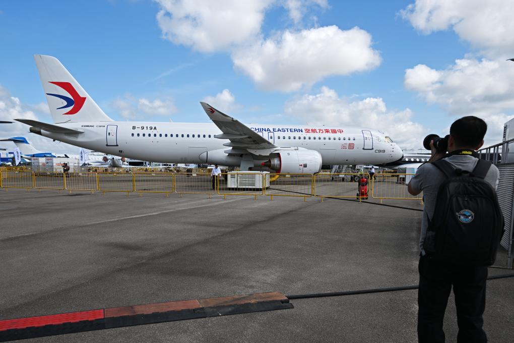 2月20日,一架中国东方航空公司C919客机在新加坡航展上做静态展示。新华社发(邓智炜摄)