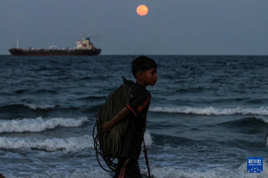 2月24日,一名男孩走在印度尼西亚亚齐省司马威的海岸边,身后明月高悬。