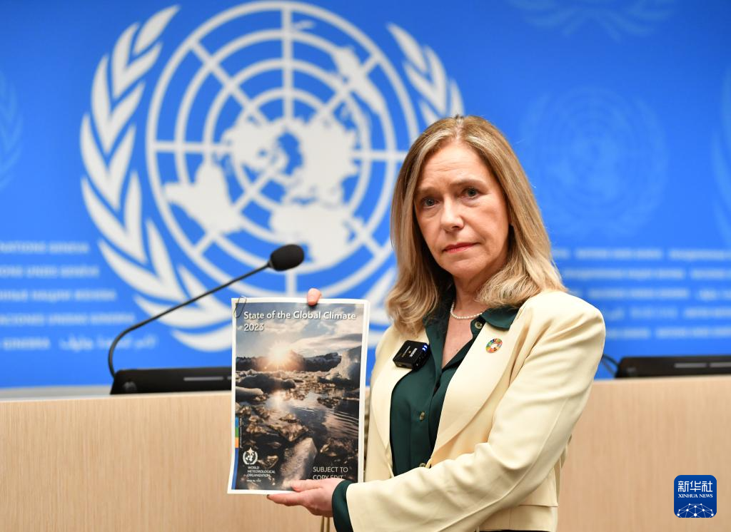 3月19日,在瑞士日内瓦,世界气象组织秘书长塞莱丝特·绍洛拿着《2023年全球气候状况报告》留影。