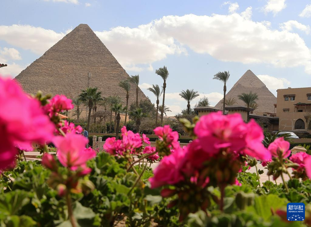 这是3月19日在埃及吉萨胡夫金字塔旁拍摄的鲜花和绿植。