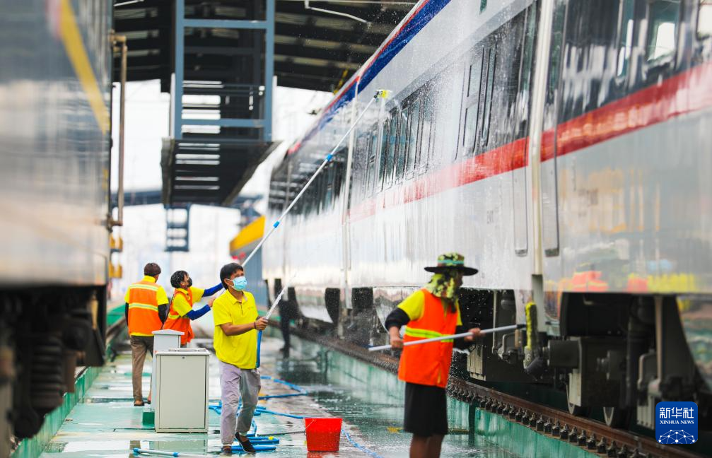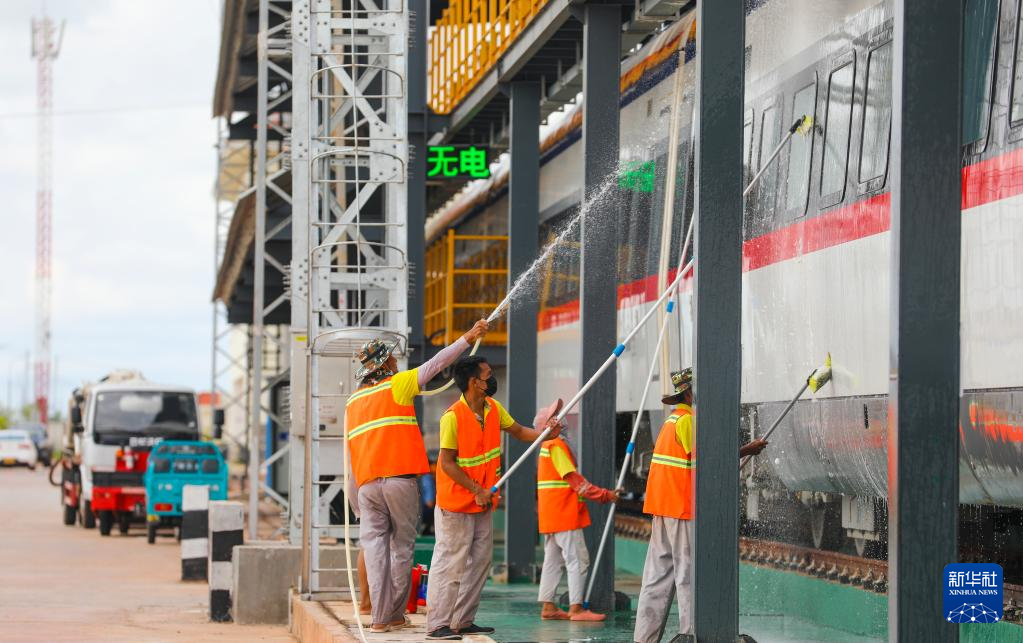 4月3日,在中老铁路老挝万象客整所,工作人员对“澜沧号”动车组列车进行清洗作业。
