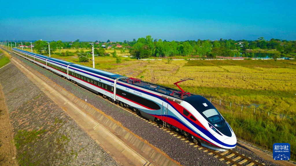 4月2日,中老铁路“澜沧号”动车奔驰在老挝万象。