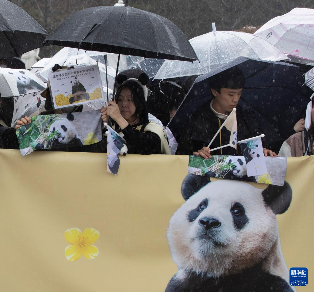 4月3日,人们在韩国京畿道龙仁市的爱宝乐园雨中送别大熊猫“福宝”。
