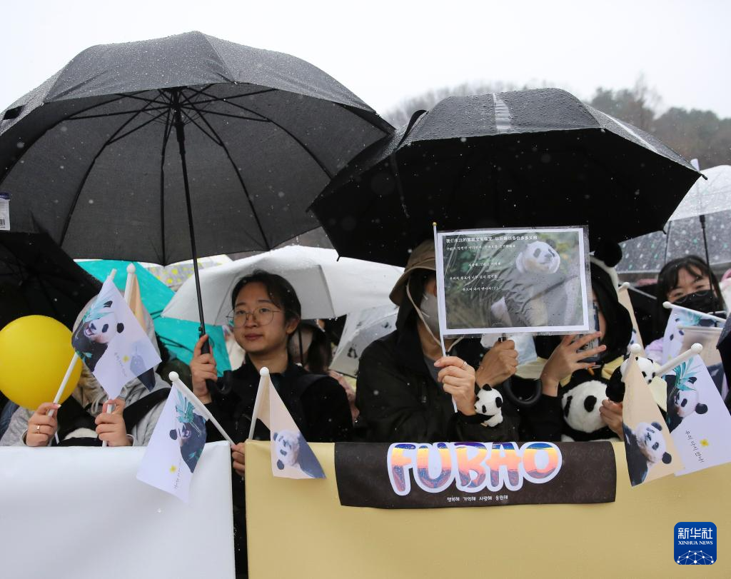 旅韩大熊猫“福宝”3日离开位于韩国京畿道龙仁市的爱宝乐园,踏上回国旅程。许多韩国民众冒雨来到爱宝乐园,为“福宝”送行。