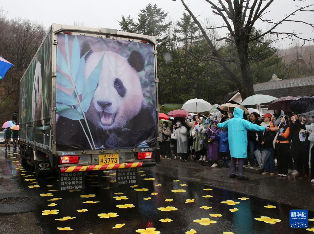 4月3日,人们在韩国京畿道龙仁市的爱宝乐园雨中送别大熊猫“福宝”。新华社记者 姚琪琳 摄