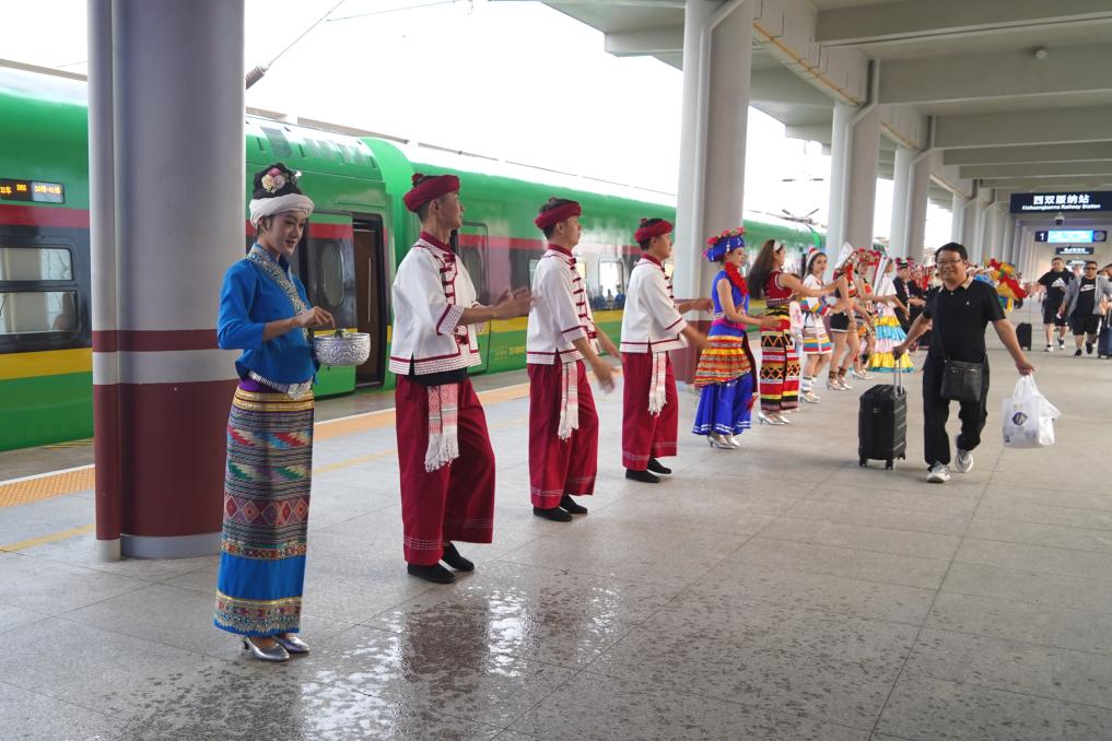 西双版纳站站台上,当地群众庆祝中国西双版纳至老挝琅勃拉邦开行国际旅客列车。(王一翔 摄)
