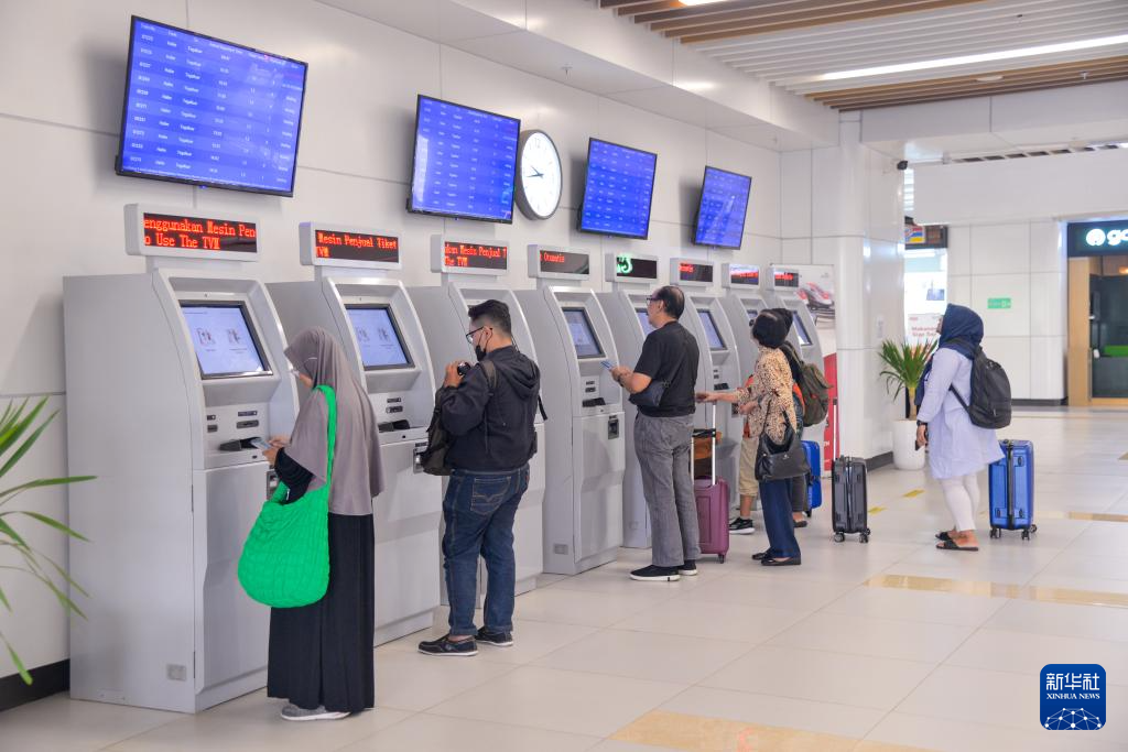 4月17日,在印度尼西亚雅加达哈利姆站,乘客在自助取票机前取票。
