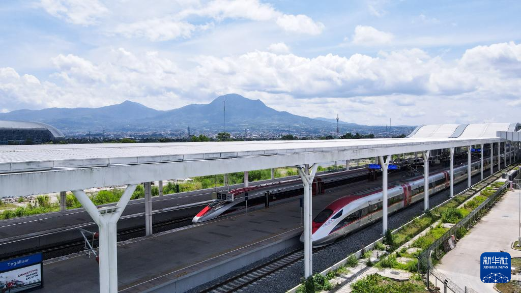 4月17日,在印度尼西亚万隆德卡鲁尔站拍摄的两列停靠在站台的雅万高铁高速动车组(无人机照片)。
