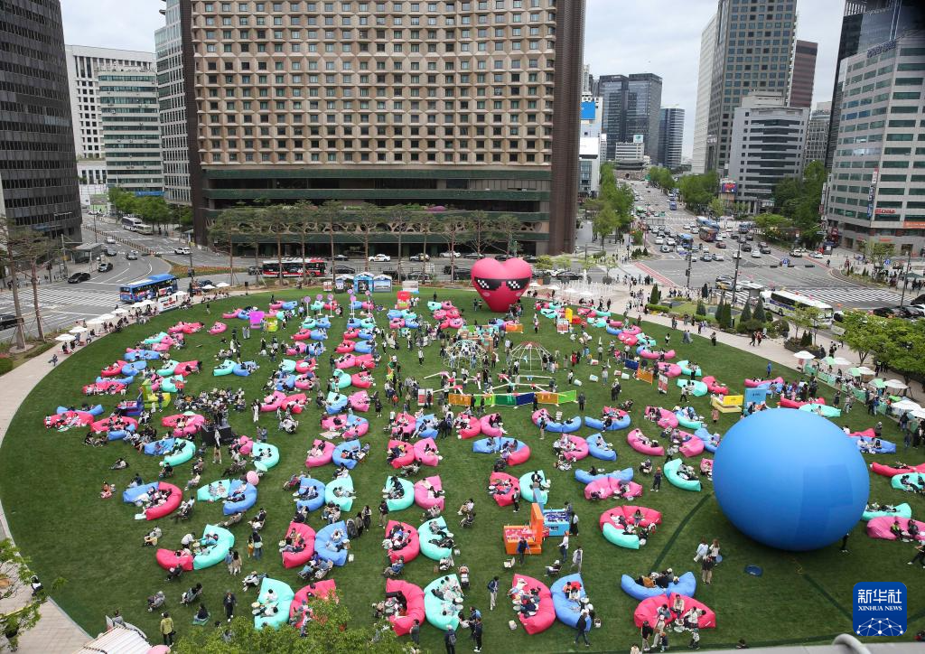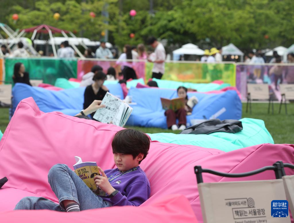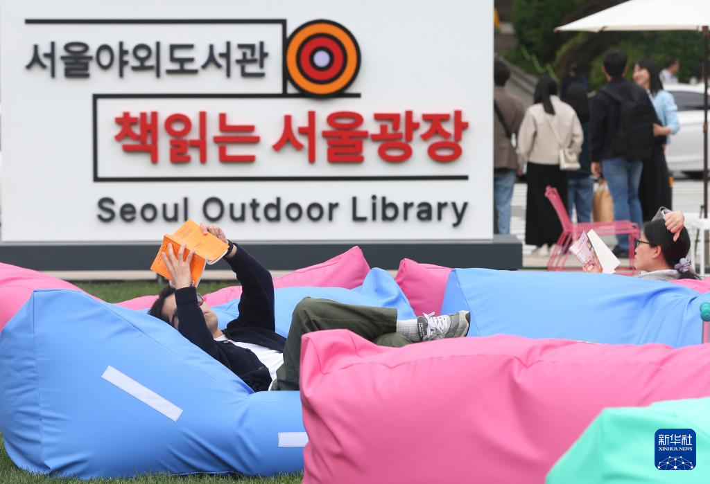4月21日,市民在韩国首尔广场的露天图书馆读书、休闲。