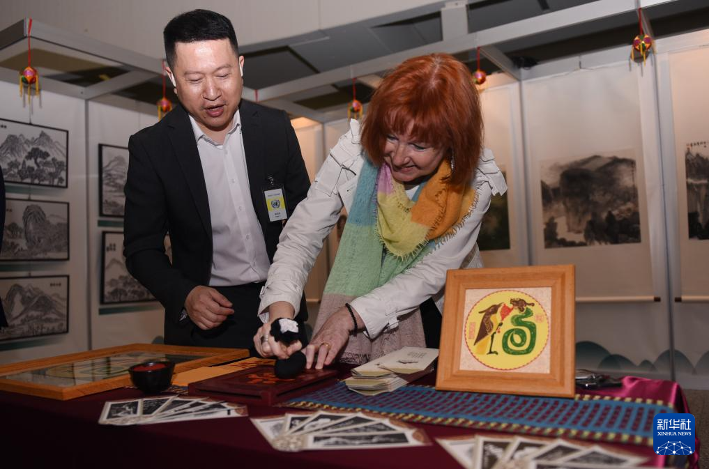 5月6日,在奥地利维也纳,来宾在2024年维也纳联合国中文日活动上体验拓印。
