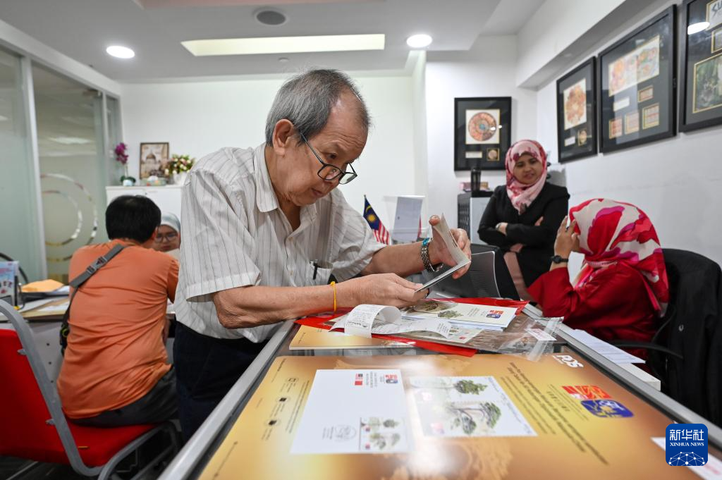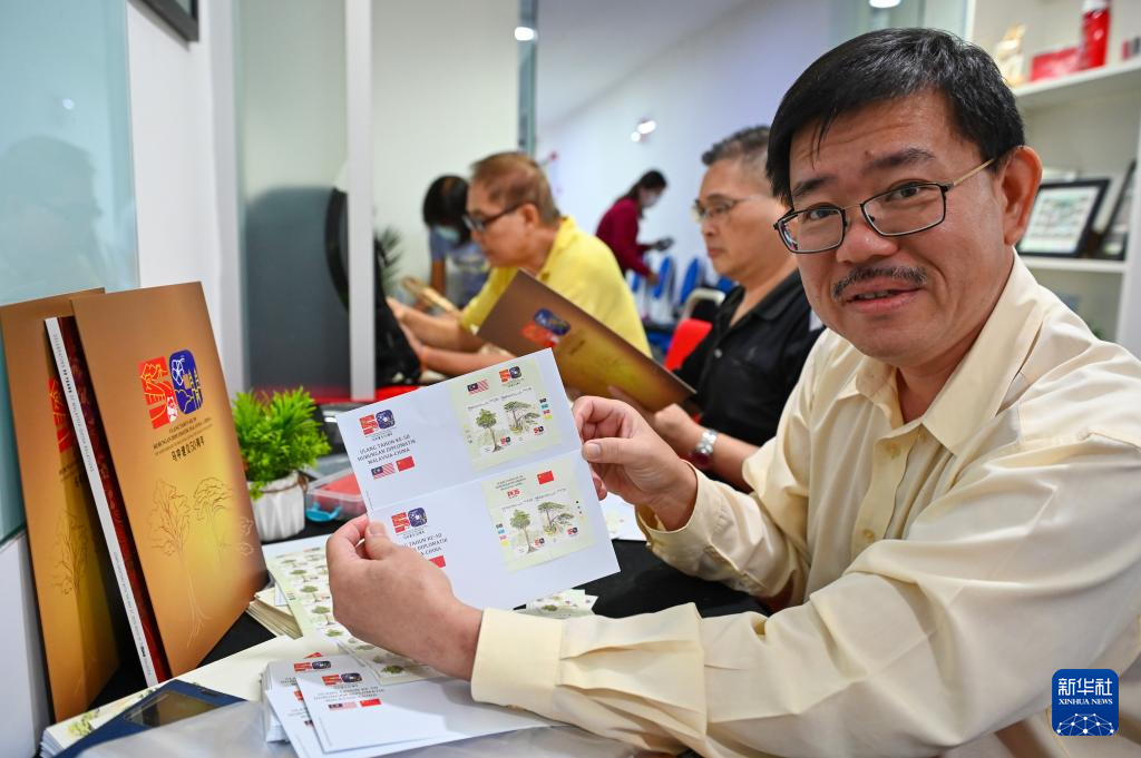 5月31日,在马来西亚吉隆坡,顾客展示购买到的《中马建交五十周年》联合纪念邮票。
