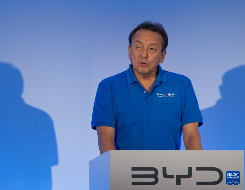 6月11日,在日本静冈县御殿场市,比亚迪汽车日本公司社长东福寺厚树在试驾活动上介绍新车的相关情况。新华社记者 岳晨星 摄