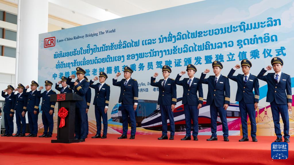 中老铁路机车驾驶证颁发暨独立乘务首发仪式5日在中老铁路万象站举行,中老铁路火车首次实现由老挝籍火车司机独立值乘。