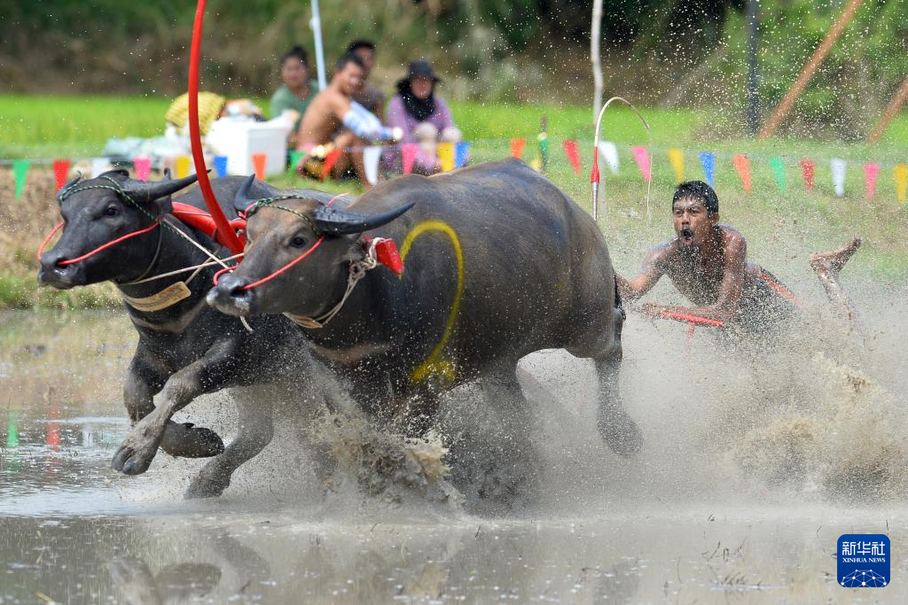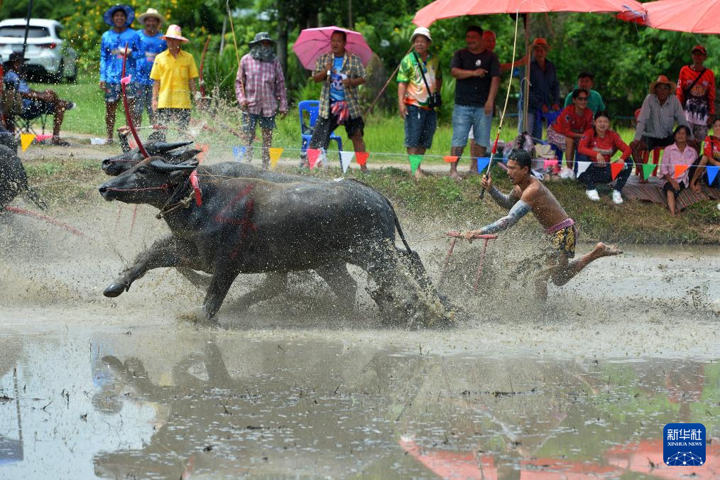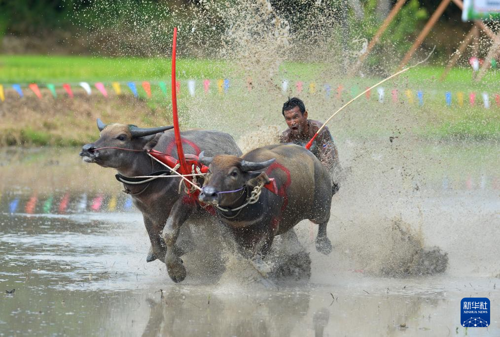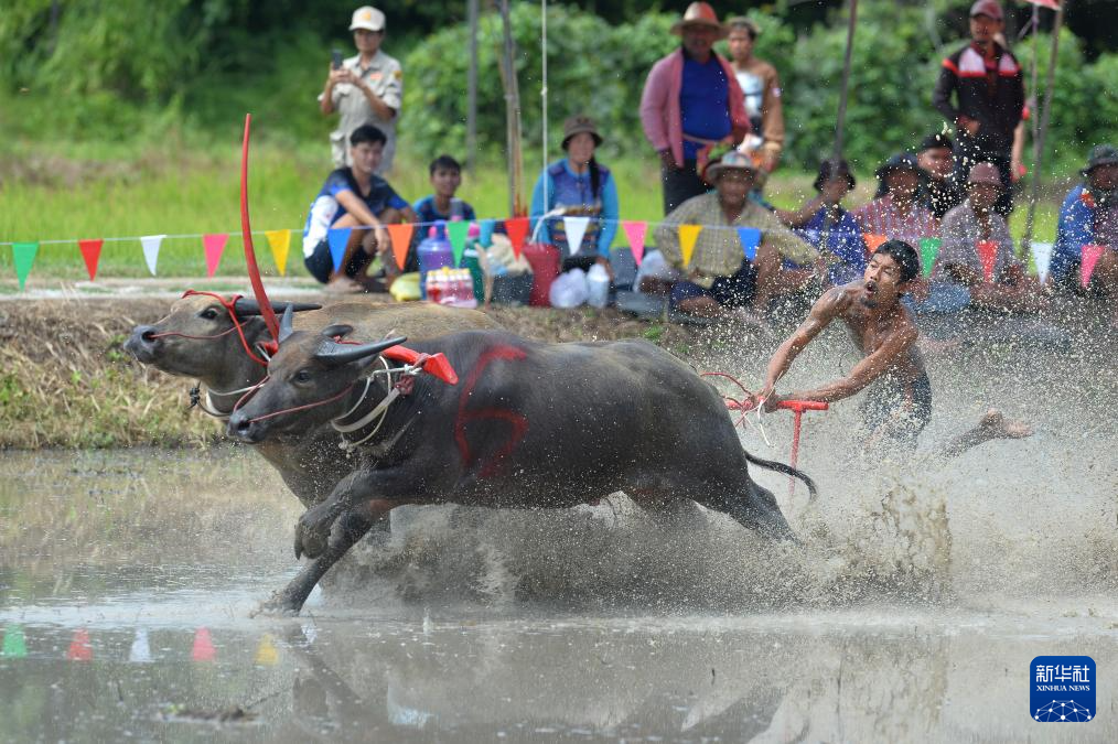 8月4日,参赛者在泰国春武里府驾驭水牛参加比赛。