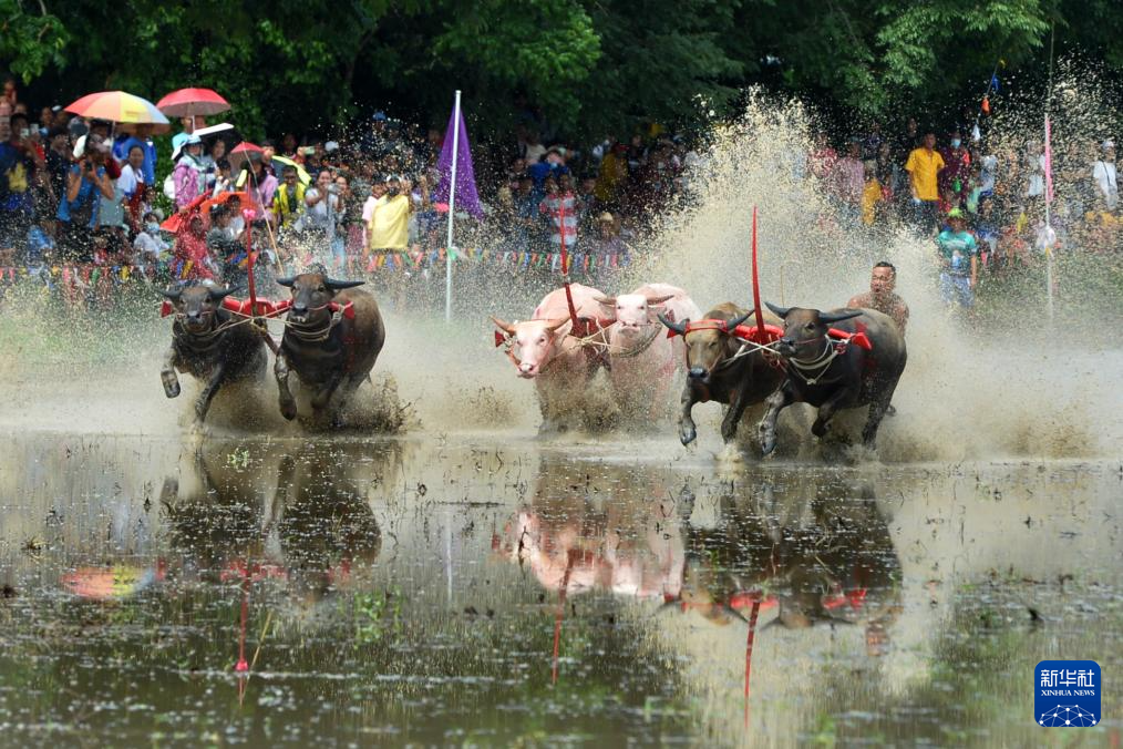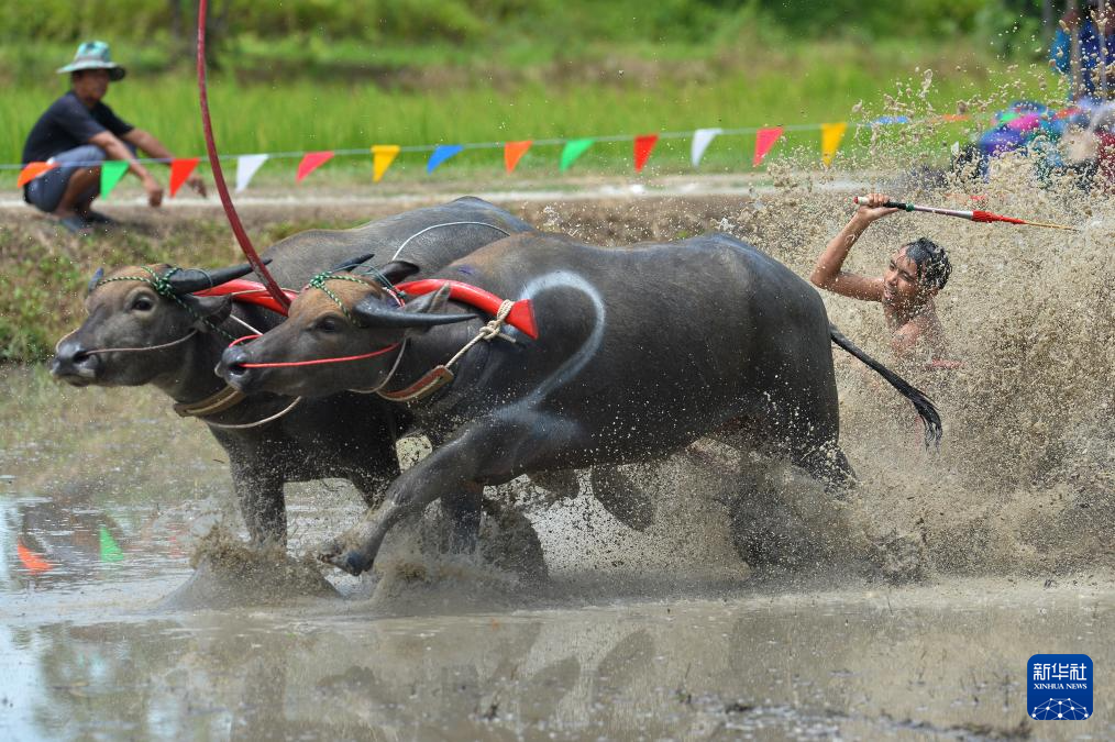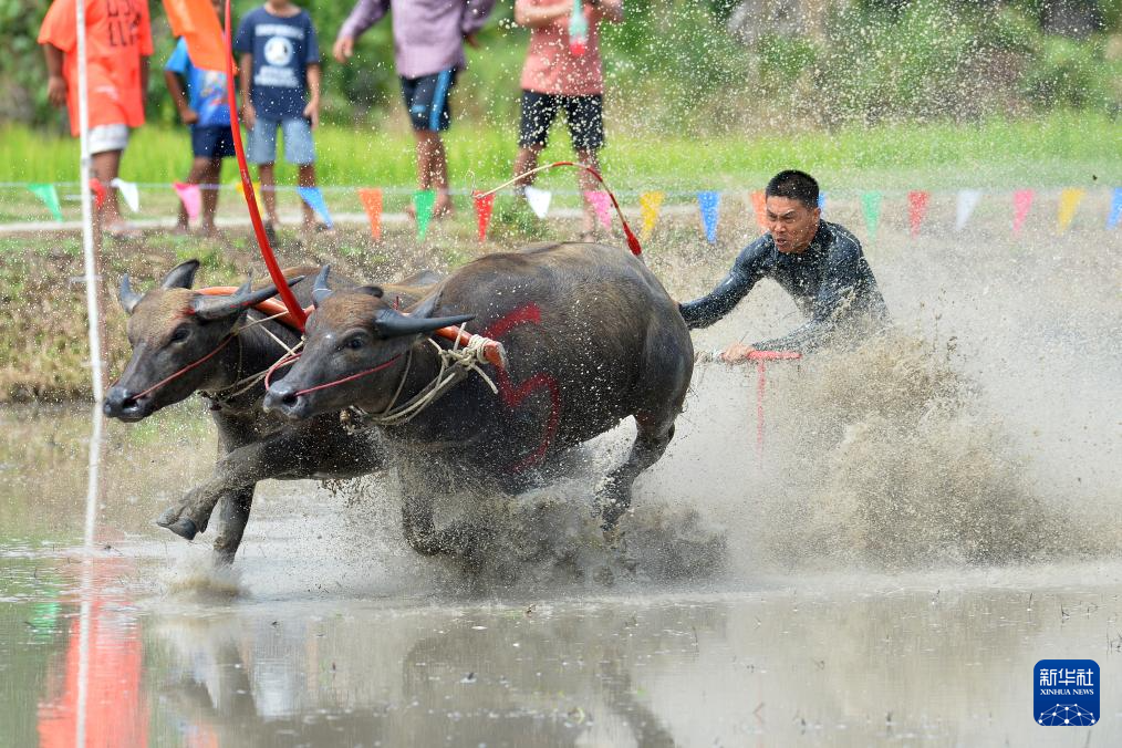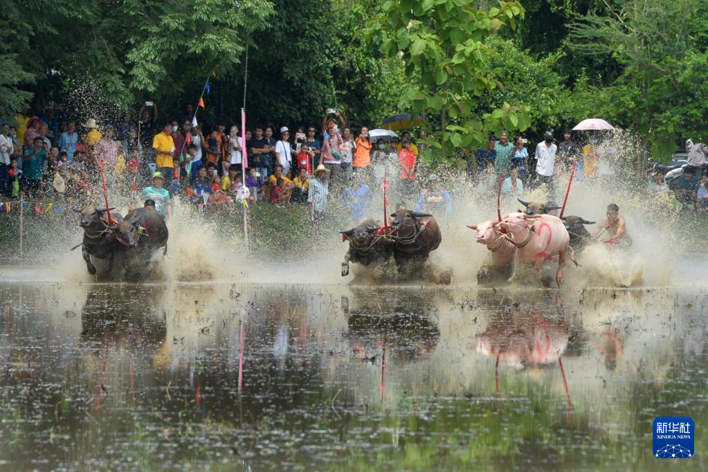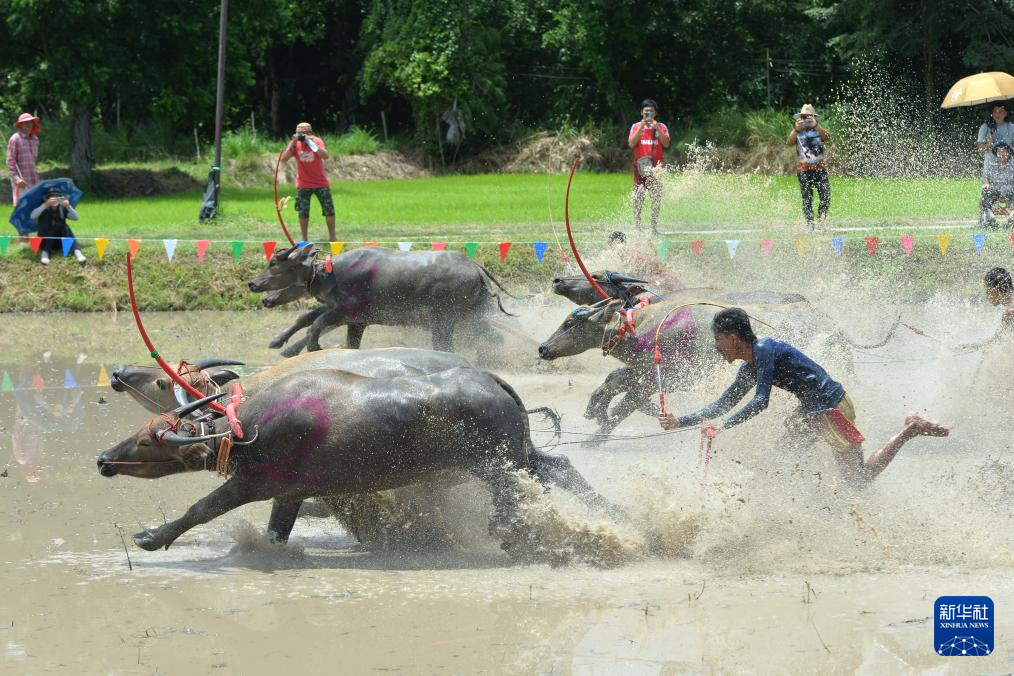 8月4日,参赛者在泰国春武里府驾驭水牛参加比赛。