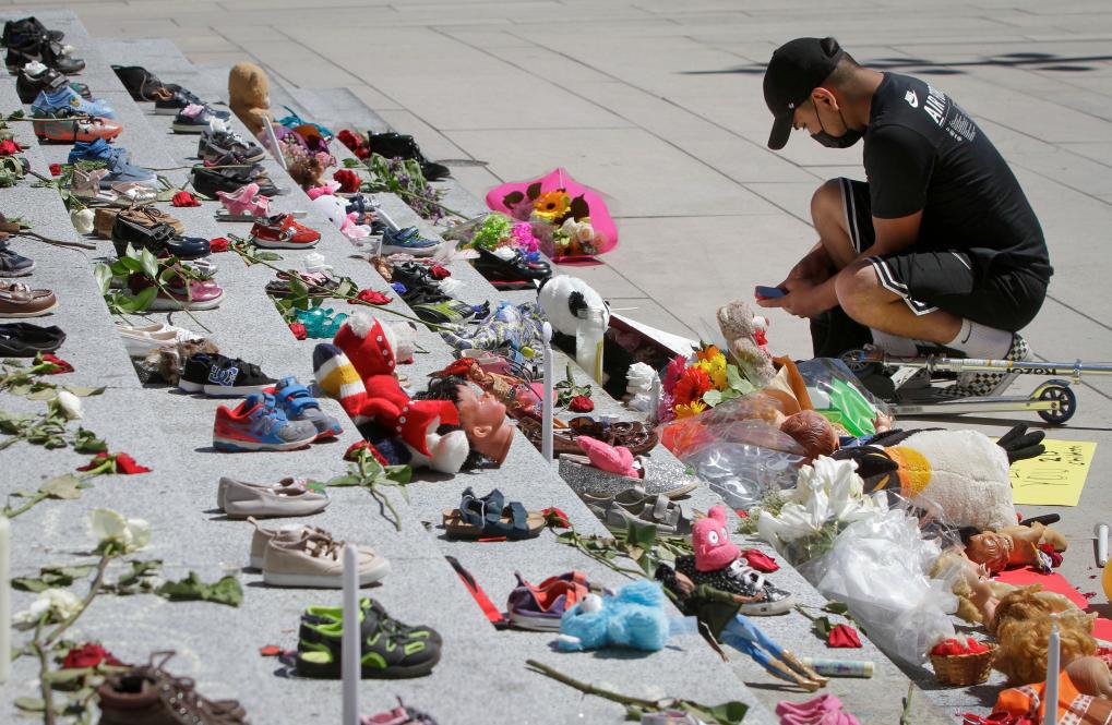 2021年5月29日,一名市民在加拿大温哥华美术馆门外悼念不列颠哥伦比亚省坎卢普斯市一所原住民寄宿学校的死者。新华社发(梁森摄)